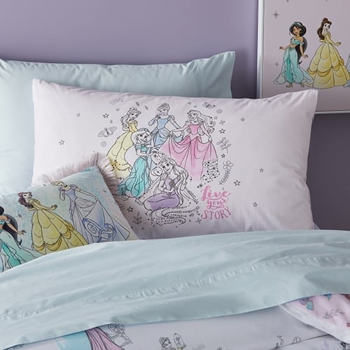Inspire your little one to love who they are with the Disney Princess Live your Story text pillowcase or add a little magic with the Disney Princess cushion – complete with fluttering metallic fringing and embroidered glitter stars.