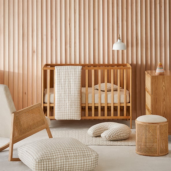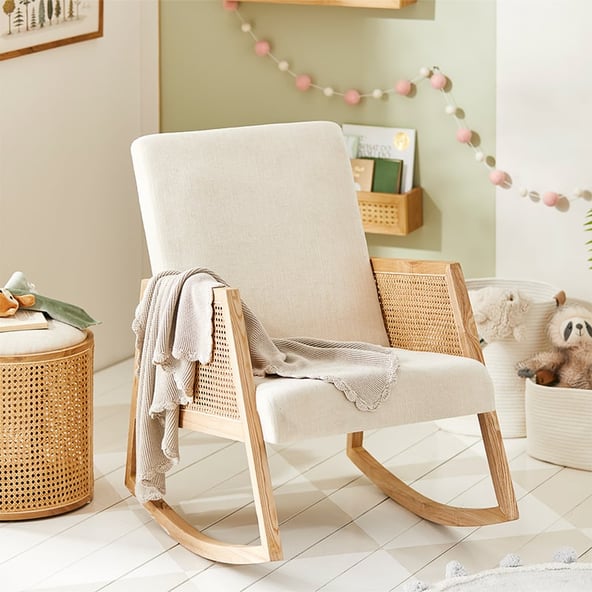 Creating a quiet nursing corner where you can sit and bond with your baby will have a world of benefits for both of you. Choose a rocking chair that is both comfortable and beautiful. Our Arden Rocking Chair provides support and comfort and will make a stylish statement in the corner of your nursery. The ash rattan in creamy white will complement any style – and there's a matching footstool to rest your tired feet.