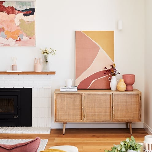 A popular question we get asked is ‘How should I style my sideboard?’ Our rule of thumb: imagine creating a three-dimensional triangle, by starting with the artwork as your focal point, and then arranging décor & accessories around it. The beauty of this is that it is versatile and you can change it up as often as you like.