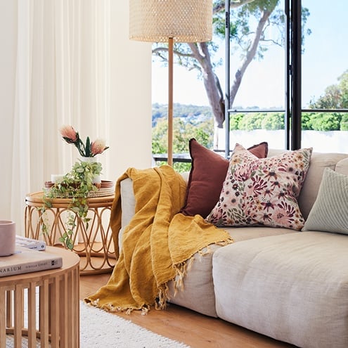 Styling your couch is the perfect opportunity to play with different shapes and sizes to add some interest. Start with large size cushions on the outside, then work in with smaller cushions. Make sure you’re sticking with your chosen colour palette to ensure you don’t stray too far.