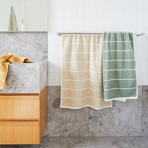 We've picked neutral colours with touches of eucalyptus green – focusing on soft & plush towels, styling a bathroom bench, and adding the finishing touches with wall art. So whether you have a small or spacious bathroom, these styling tips are suitable for any space. Let’s go!