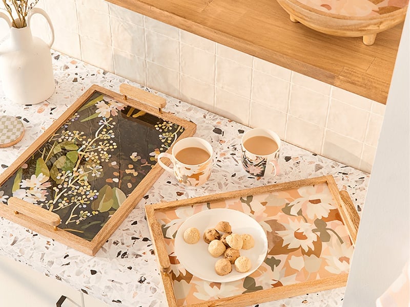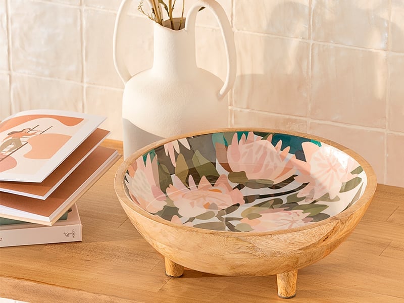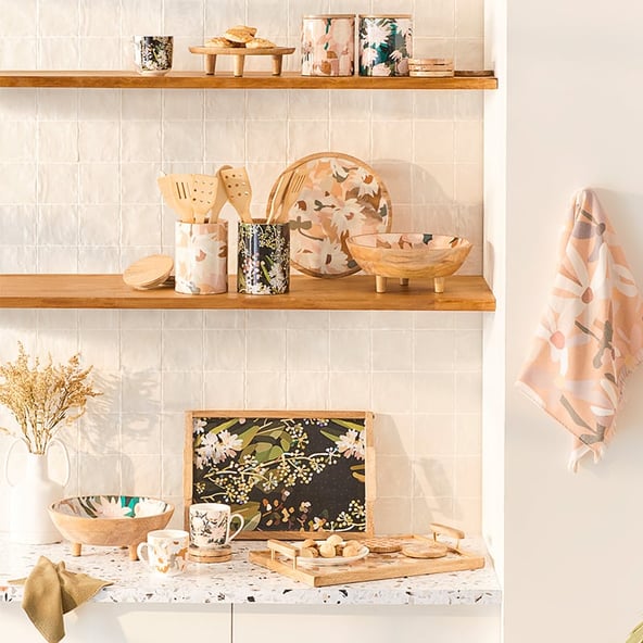 Bring a fresh feel into the kitchen with our Kimmy Hogan x Adairs servingware. We love the platters and bowls featuring the Paper Daisies, Splendour, or Blush designs set against solid mango wood.
