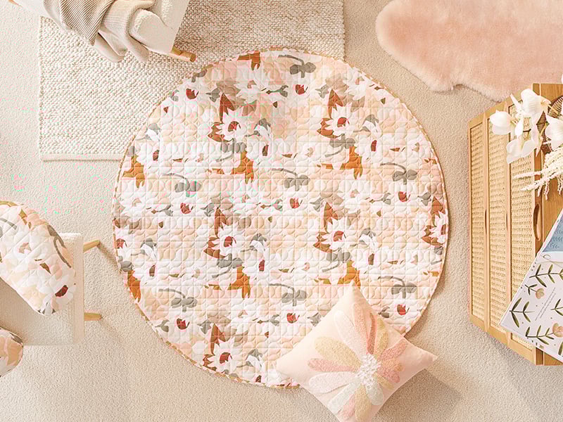 The nursery range includes all the essentials for a beautiful moment with your little one, with the Paper Daisies design printed across a nursing pillow, playmat, swaddles and towels.