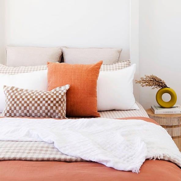 In the main bedroom at Rolling Seas, we chose fresh white Vintage Washed Linen bedding as the base, and then added earthy, rusty accent tones through the cushions and throw.