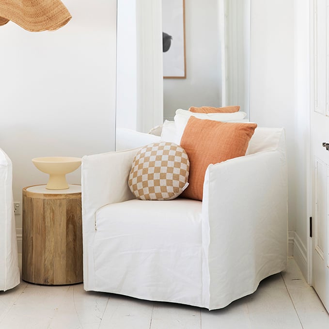 In-keeping with the style of the house and its coastal setting, our vision was natural cream, clay and rust tones throughout the home to add warmth - in contrast to the cool white walls and floors. We used the same colour palette across the furniture, soft furnishings and linens alike to achieve a cool, calm and coastal feel in every room.