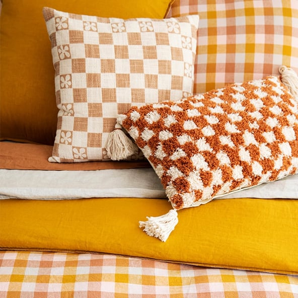 The checkerboard trend is here to stay. Three Birds styled their room with these textured check cushions, drenched in warm shades of rust and bronze.